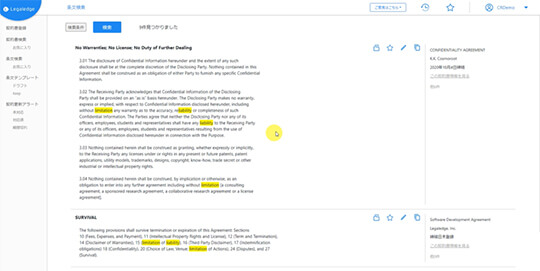 また、全ての契約書を法務チームでリーガルチェックしているのですが、「こういう条文はどういう表現をしていたかな」と思った時に、条文検索機能を利用して、レビューの際の参考にするということもしています。この辺りは山内さんがメインで担当しているのですが、山内さんいかがでしょうか。